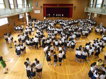 木曜日の朝は、全校児童が集まって児童集会があります。児童集会では集会委員会のお兄さんとお姉さんがゲームやクイズを考えて、みんなを楽しませてくれます。