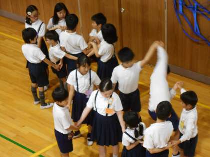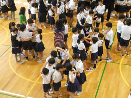 今日の集会は、「人間知恵の輪」ゲームでした。たてわり班で円をつくって並び、右手をとなり以外の人と、左手をとなり以外の人とつなぎます。スタートの合図で、人間知恵の輪をほどいていきます。つないだ手を離さないようにしながら、くぐったり、またいだり、裏返ったりして、少しずつほどいていくと…。