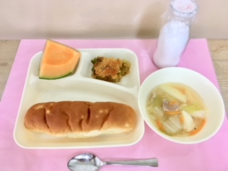 【おさつパン、カレードリア、スープ、クインシーメロン】