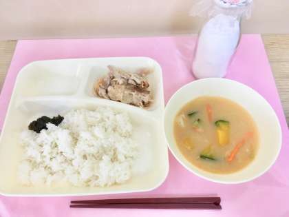 みそ汁は、キャベツ、にんじん、かぼちゃが入っています。