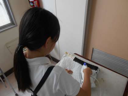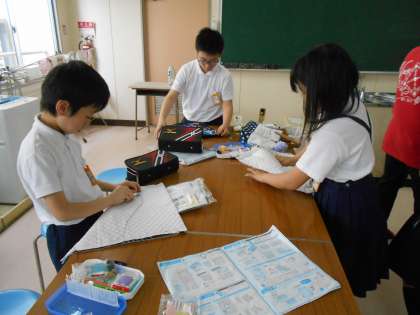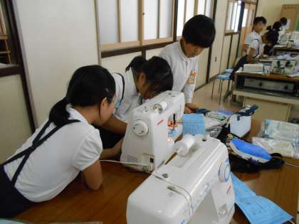 5年生は家庭科で裁縫をしています。基本の練習を終えて、今は一泊自然体験学習で使うナップサックを作っています。家庭科室でミシンを使い、カタカタカタカタと調子よく製作しています。