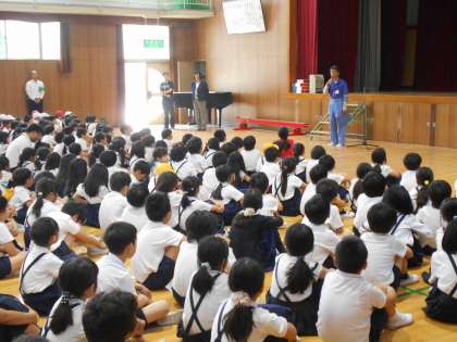 不審者対応訓練の最後には、全児童が講堂に集まってまとめのお話を聞きました。