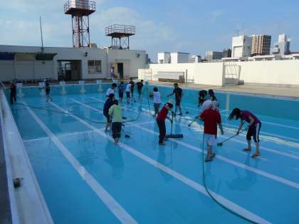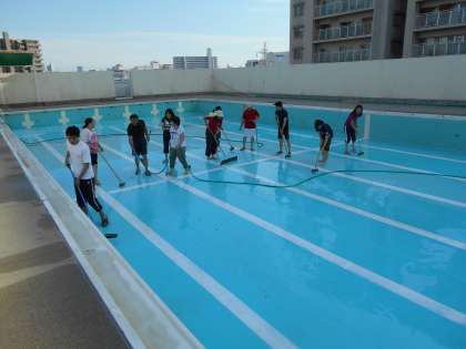 プール開きに向けて、これまで管理作業員さんが何日もかけてプールの中や周りを、とてもきれいにしてくださいました。そして今日は、教職員でプールと準備室、プールまで上がる階段周りなどの清掃をしました。