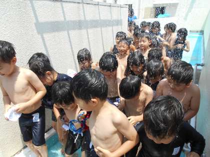 1年生の子ども達は、小学校の屋上プールまでが上がってくるのが初めてです。幼稚園や保育所よりも大きな、小学校のプールを見てみんな大興奮。準備体操をしてから、順番にシャワーに入っていくと、キャーキャーと大喜びです。