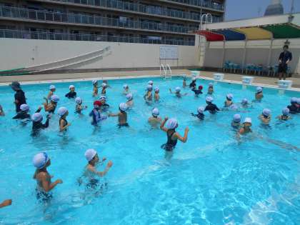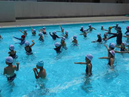 プールに入ってからは、音楽に合わせたダンスで水慣れをします。パシャパシャと水をかけあったり、動物に変身して、楽しく水遊びをしました。