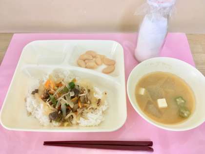 今日の大福豆(おおふくまめ)は、北海道の胆振(いぶり)地方や北見地方で、たくさんとれる豆です。味がよく、豆の色が真っ白のため、甘なっとう、豆きんとんなどに使われます。今日は、放送で、とうがんのクイズをだしました。今日の牛丼は、人気メニューだけあって、たくさん食べてくれていましたよ!!