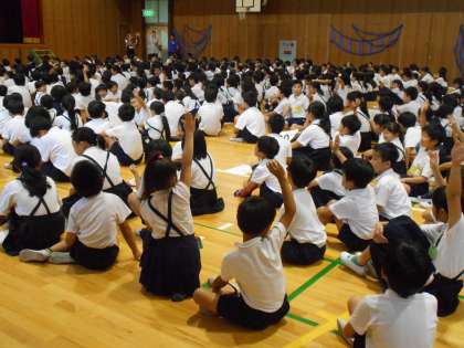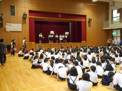 朝から雨がはげしく降っていましたが、子ども達は元気に登校してきました。木曜日の児童集会では、集会委員会が「先生あてクイズ」をしてくれました。