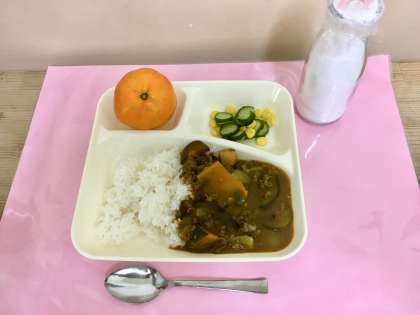 【夏野菜のカレーライス、きゅうりとコーンのサラダ、みかん(冷)】