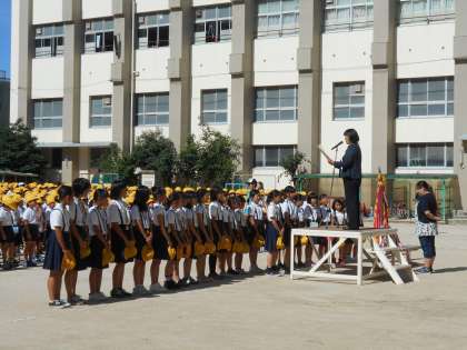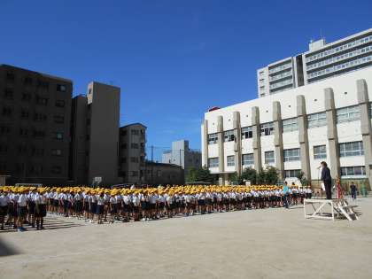 先週末はたくさんの雨が降り、西日本を中心に多くの被害をもたらしました。大阪市でも大雨警報が出るほどのお天気で、子ども達も心配な週末を過ごしたことでしょう。月曜日の朝はひさしぶりのお天気に恵まれ、鮮やかな青い色の空の下、子ども達もすっきりとした表情で児童朝会に集まりました。今週は、運動場で元気に遊ぶ子ども達の姿が、たくさん見られそうです。