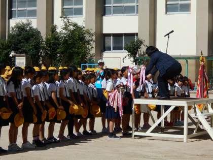 校長先生からは、「晴れた日はもちろん、雨上がりにも練習をしてきた、努力の成果です。試合に出た人だけでなく、応援をしているメンバーも含めた、みんなの優勝です。」と褒めていただきました。賞状と二つの優勝杯を掲げたメンバーに、全校児童から大きな拍手を贈りました。