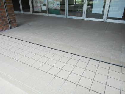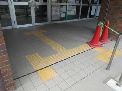 玄関のタイルの間にはすき間ができ、児童の安全を確保するために臨時でテープで補修をしたり三角コーンを立てたりして、気をつけて歩行をするように指導していました。この夏休みに工事が行われ、以前のようにきれいに直していただきました。