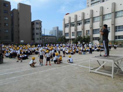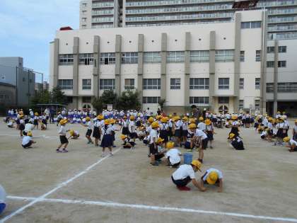 児童朝会の時間を使い、運動会に向けて運動場の整備をしました。例年は、走ってこけたときにケガをしないよう、全児童で小石を拾って集めます。しかし、今回は二日前に大型台風が襲来したため、葉っぱや小枝、プラスチックの破片など、小石以外のゴミもありました。