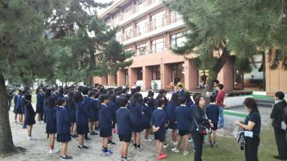 修学旅行二日目になりました。みんな元気に朝の会に参加しました。辺りの景色も楽しみました。