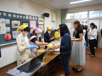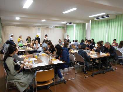 子ども達の給食を参観していただいた後は、参加者のみなさんの給食の時間です。協力して給食を配膳し、手を合わせて「いただきます♪」をしました。保護者のみなさんのほとんどは「給食を食べるのは子どものとき以来です」という方ばかりで、お子さんが学校で毎日食べている給食を味わって喜んでくださっていました。