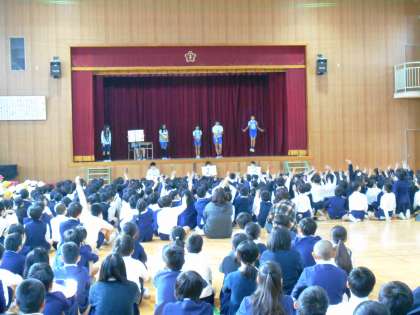 木曜日の児童朝会のの時間を使って、運動委員会の活動発表がありました。今回は「なわとびクイズ」と、来週から始まる「なわとび週間」のお知らせです。