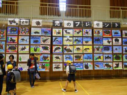 3限目の学習参観が終わってからは,児童とお家の人達がいっしょに講堂に入り,作品の鑑賞ができます。自分の作品について説明をしたり,他の学年の良い作品について話したりして,鑑賞を楽しんでいました。