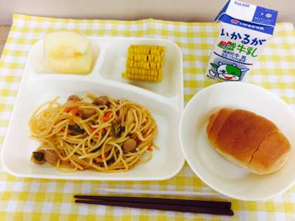 【黒糖パン1/2,チキントマトスパゲッティ,焼きとうもろこし,りんご】