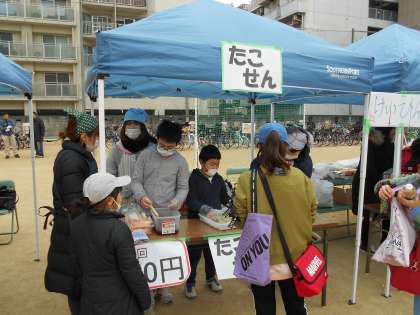 10時の開会から子ども達とお家の方がどんどん来校され、一気ににぎやかになりました。名物の「宮原焼き」や焼き鳥、唐揚げ、フライドポテト、肉まんとあんまんなど、本格的な食べ物のお店が並んでいます。子ども達はお友達と並んでお買い物をして、「美味しい」と笑顔でほおばっていました。