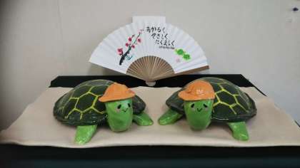 焼き物、陶芸作品としても誕生しました。校長室にいます。