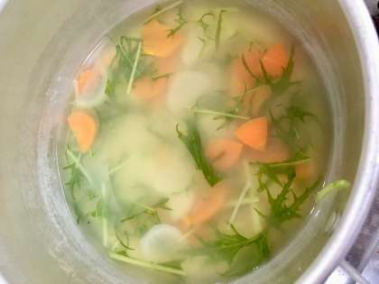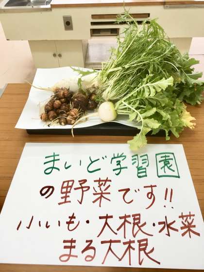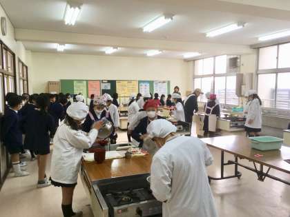 今日は,クラブ見学会があり,3年生が見学をしました。ホームメイキングクラブでは,まいど学習園の野菜を使って,お雑煮作りをしました。この日は,朝に収穫した野菜から,写真にはのっていませんが,にんじん,だいこん,水菜を使いました。スペシャルゲストは,まいど学習園の南さんです!!スペシャルゲストのたすきをつけて,お雑煮作りを見守っていただきました。見学していた3年生も「あ!南さんだ!!」と声があがっていました。南さんから,「野菜の味がしっかりでていて,美味しいお雑煮でした!」と,お褒めの言葉をいただきました。