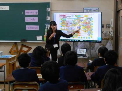 きのうの授業は、英語でのあいさつから始まりました。1年生から日々10分程度の英語の時間を設けていおり、英語の短いアニメを見たり、ダンスを入れた歌なども歌ったりしているので、子ども達は英語にとても慣れています。あいさつに続けてのアルファベットの歌も元気いっぱいです。