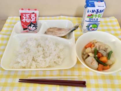 今日は,節分の行事献立です!2年生の教室に行き,イラストを使って,節分の行事について,豆まきの意味やいわしとひいらぎの葉の秘密についてなど,お話しました。みんな,「豆まきしたでー!!」「恵方巻食べたー!」と教えてくれました!