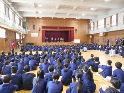 幕の後から5人の「あいさつレンジャー」が登場すると、講堂いっぱに拍手が沸き起こりました。今回のあいさつ週間のスローガンは、「太陽のような笑顔であいさつをしよう」です。