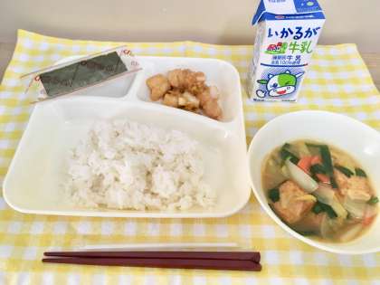 あつあげとはくさいの中華煮は,あつあげ,はくさい,たまねぎ,にんじん,青みににらを使用し,でんぷんでとろみをつけています。これに焼きのりが1人1袋つきます。