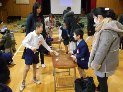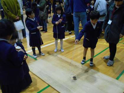 1年生は生活科で学習した「昔の遊び」を、講堂で保護者の方と楽しみました。コマ回しやけん玉、めんこやお手玉など、いろいろな遊びがあります。お家の方が子ども達にコマ回しやけん玉の技を見せてくださったり、子ども達と一緒にゲームをしたりして、1年生の子ども達もとても喜んでいました。