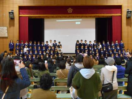 参観の最後には前のひな壇に1年生が並んで、大きな声で呼びかけをしたり可愛らしい声で歌ったり演技を披露しました。入学してから、もう少しで1年になります。この一年間で、豊かに成長した姿を保護者のみなさんに見ていただきました。
