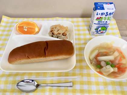 スープは,ウインナーとじゃがいも,キャベツ,だいこん,にんじん,彩りにグリンピースを使用した具だくさんスープです。
