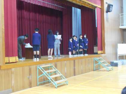 今回は「特選賞」に4名の児童が、「佳作賞」に7名の児童が、そして「努力賞」に20名もの児童が選ばれました。順番に名前を呼ばれ、講堂の舞台に上がって、校長先生から立派な賞状を手渡していただきました。