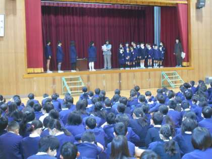 3月初めの児童朝会は朝から雨が降るお天気で、全児童が講堂に集まって行いました。
