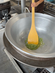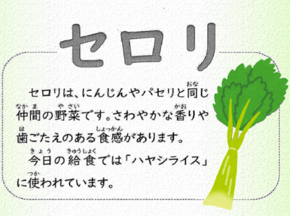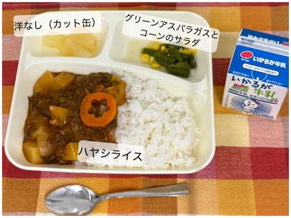 今日の献立は、ハヤシライス、グリーンアスパラガスとコーンのサラダ、洋なし(カット缶)、牛乳です。