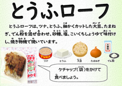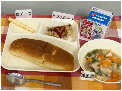 今日の献立は、とうふローフ、洋風煮、棒チーズ、おさつパン、牛乳です。