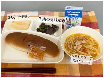 今日の献立は、牛肉の香味焼き、トマトのスープスパゲッティ、 なし (二十世紀)、コッペパン、みかんジャム、牛乳です。
