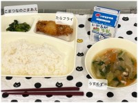 今日の献立は、カツ丼、きゅうりの赤じそあえ、 ソフト黒豆、牛乳です。