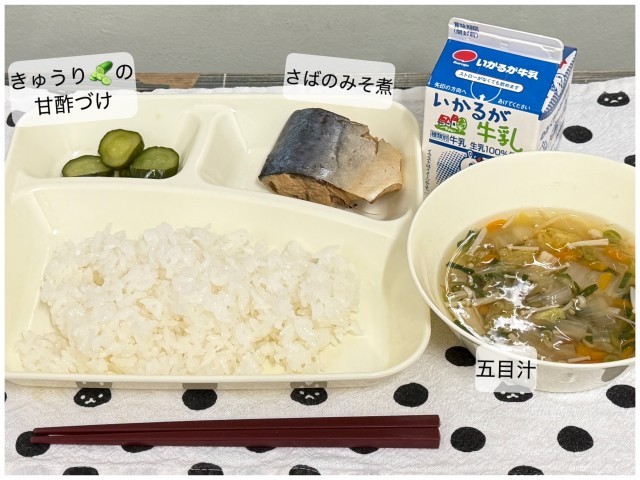 今日の献立は、さばのみそ煮、五目汁、きゅうりの甘酢づけ、ごはん、牛乳です。