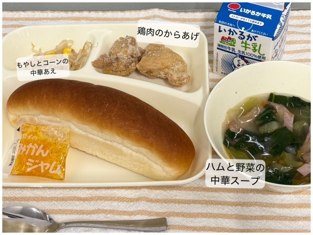 今日の献立は、鶏肉のからあげ、ハムと野菜の中華スープ、もやしとコーンの中華あえ、コッペパン、みかんジャム、牛乳です。