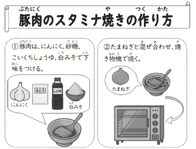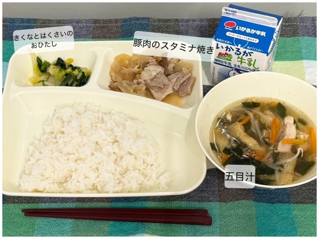 今日の献立は、豚肉のスタミナ焼き、五目汁、きくなとはくさいのおひたし、ごはん、牛乳です。