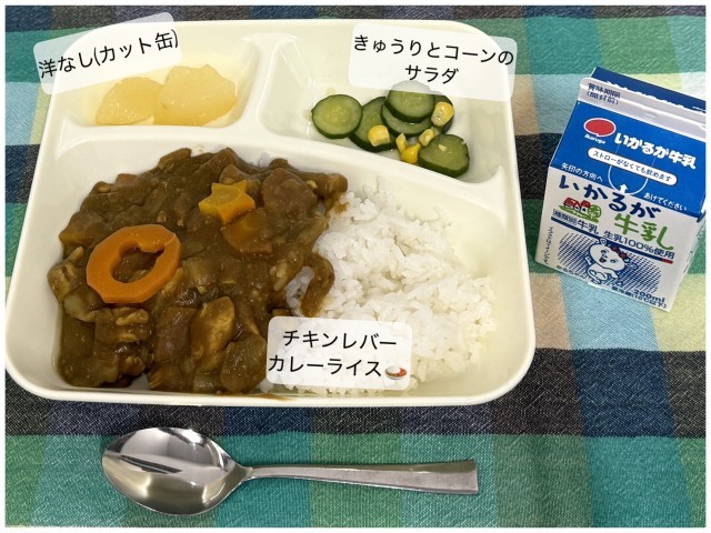 今日の献立は、チキンレバーカレーライス、きゅうりとコーンのサラダ、洋なし(カット缶)、牛乳です。