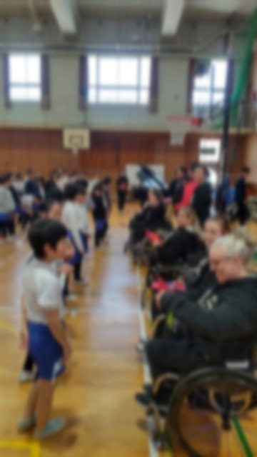 オーストラリアのパラリンピック選手が来校しました。試合前のひとときを4年生の子どもたちが交流しました。淀川区長さんもご来校されました。