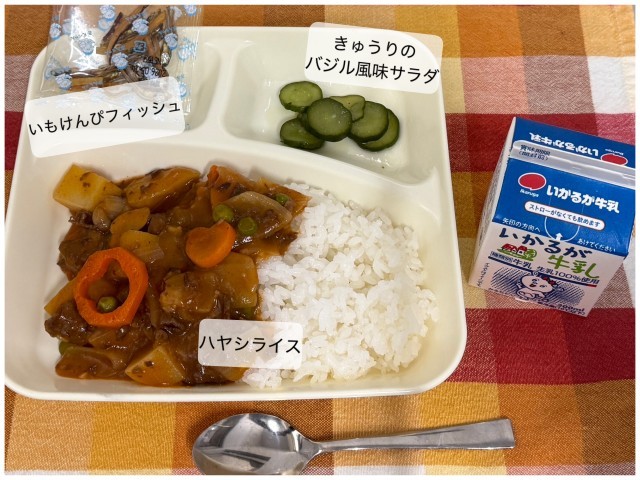 今日の献立は、ハヤシライス、きゅうりのバジル風味サラダ、いもけんぴフィッシュ、牛乳です。