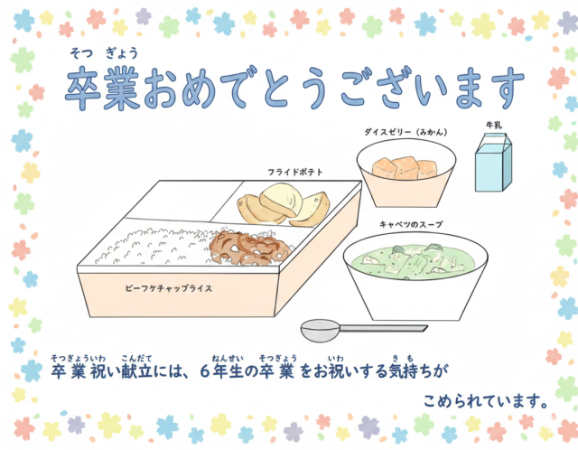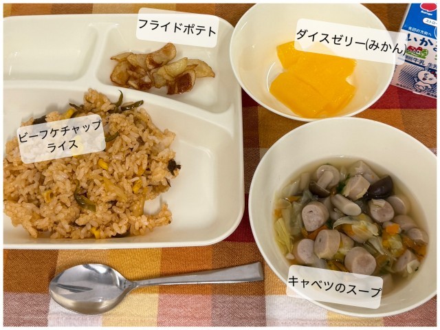 今日の献立は、ビーフケチャップライス、フライドポテト、キャベツのスープ、ダイスゼリー(みかん)、牛乳です。