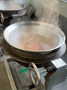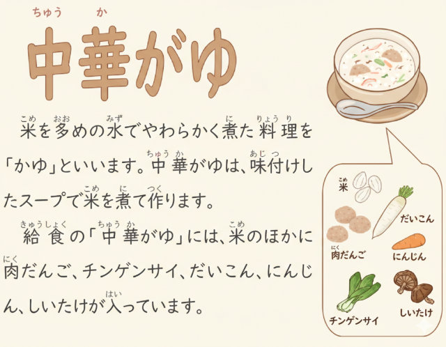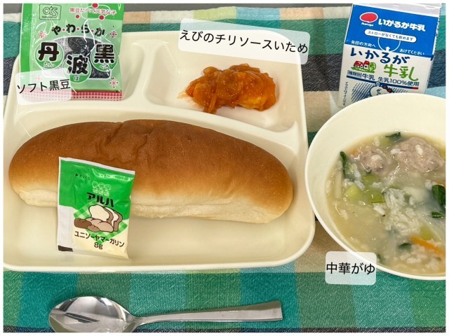今日の献立は、えびのチリソースいため、中華がゆ、