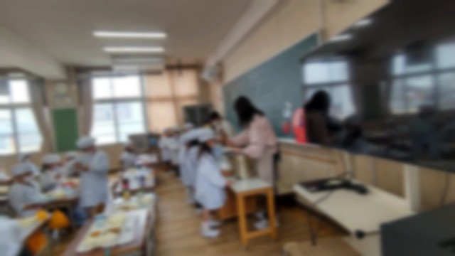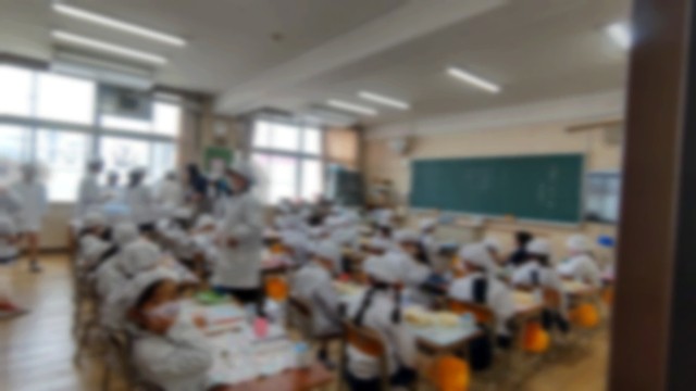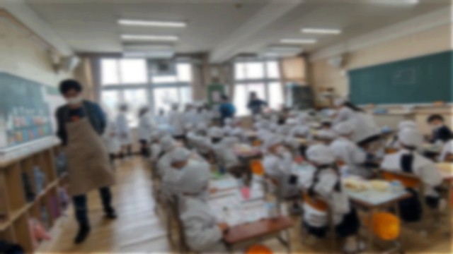 6年生のお兄さんお姉さんが給食の配膳をおしえてくださいました。1年生は先生の説明をよく聞いて、エプロンや帽子、マスクをつけて、静かに待つことごできました。1年生にとって、初めての給食。おいしく、安全に給食をいただくために、たくさんのルールを学びます。
