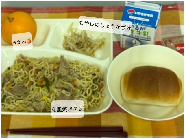 今日の献立は、和風焼きそば、もやしのしょうがづけ、 みかん、ミニコッペパン、牛乳 です。