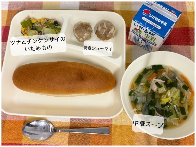 今日の献立は、焼きシューマイ、中華スープ、ツナとチンゲンサイのいためもの、 黒糖パン 牛乳 です。