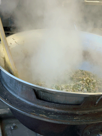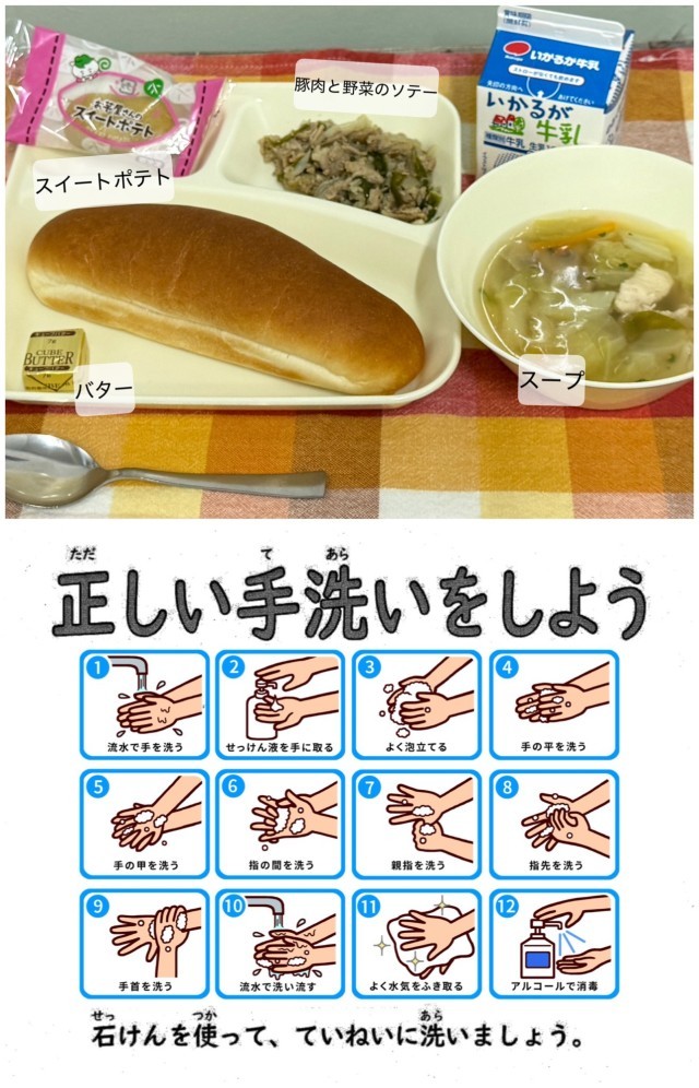 今日の献立は、豚肉と野菜のソテー、スープ、 スイートポテト、コッペパン、 バター、牛乳です。