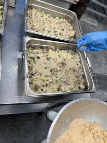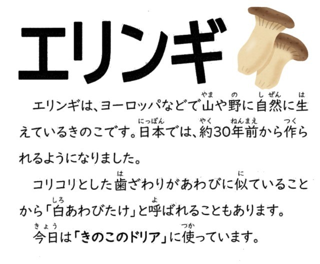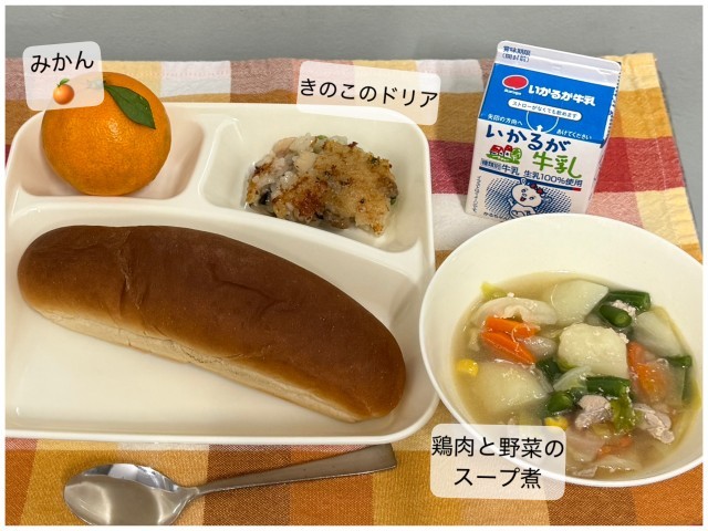 今日の献立は、きのこのドリア、鶏肉と野菜のスープ煮、 みかん、黒糖パン、牛乳です。